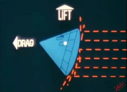简单粗暴的方式是加个翅膀,也就是航天飞机。但我们的返回舱是锥状的,那怎么产生升力呢?我们可以让返回舱的重心偏移一些。这样,隔热罩就会与气流产生一个攻角,将更多的气流向下推,返回舱就获得了一个向上的升力。如果我们还能人工控制重心的位置,那么我们还能调节升力的方向,从而精确控制落点。不过这种再入虽有升力,却比航天飞机等有翼航天器弱很多,在再入的绝大多数时间里都无法与重力抗衡。我们把这种介于弹道再入与升力再入之间的方式,称为“半弹道式再入”。