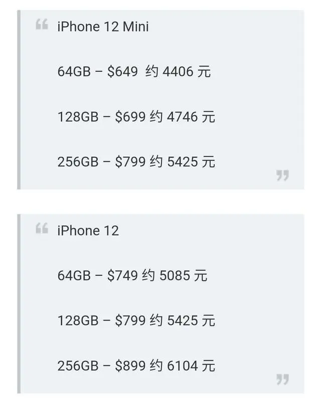 随着iPhone 12发布会时间被确认,这四款iPhone 12系列新机售价再次遭到曝光确定,其中iPhone 12Mini国行版起售价将定在4400元左右,而普通版iPhone 12起售价则会定在5000元左右,其中最贵iPhone 12 Pro Max顶配版本售价依旧会突破万元大关,这意味着iPhone 12Mini版本、普通版iPhone 12将更加吸引消费者,能够让更多的果粉们为此买单!