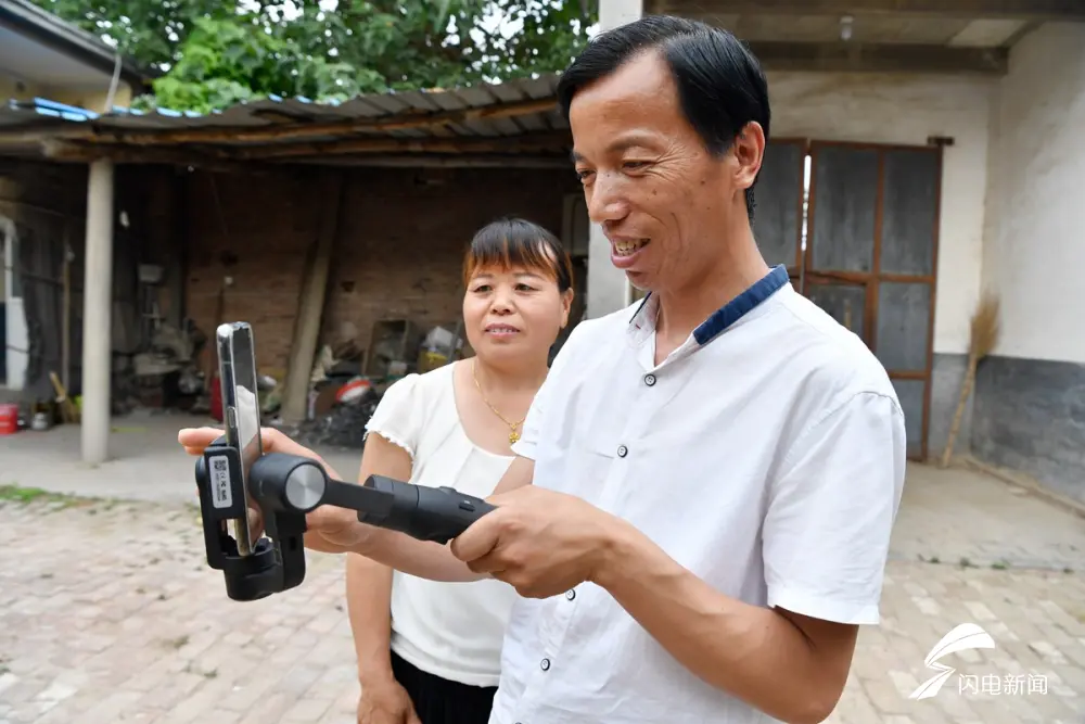 图为王业坤睡前在院子里通过手机查看当天发的视频,浏览网友留言。