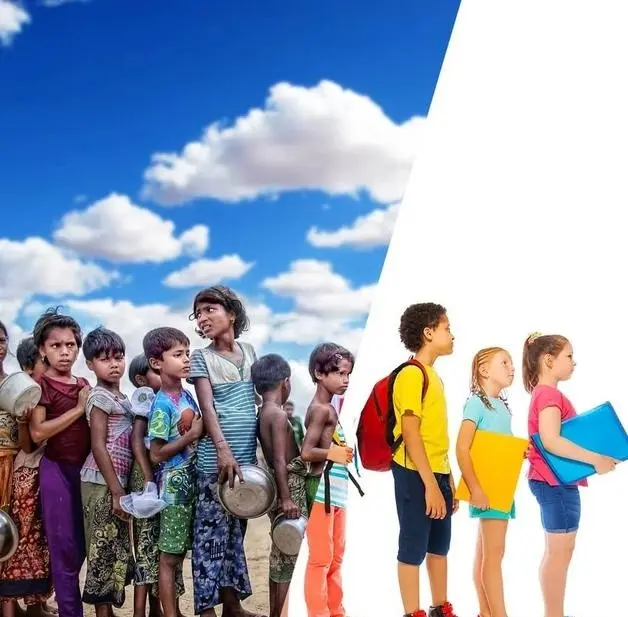 一个孩子揹着书包去上学,另外一张图片之中又是一个无家可归的孩子。墙上的绘画形成了鲜明的对比。