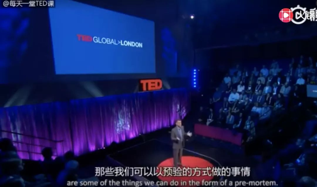 这是他从心理学家Gary Klein那里学到的。Gary前几年已经写了这个理论,也称为“事前剖析”。你们都知道事后剖析是什么意思。每当有灾难,一个专家小组就会前去调查,尝试找出导致灾难的原因,对吧?而Danny解释,在事前剖析中,你要预测,尝试想出可能出错的所有事情,然后你要尝试可能的方法来防止这些错误发生,或将损失降到最小。